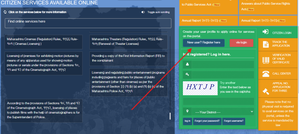 The National Register of Citizens is displayed on the right side of Aaple Sarkar’s home page. If you are already registered, enter your username, password, and captcha here, select “Your District” from the drop-down box, and click “Login.”