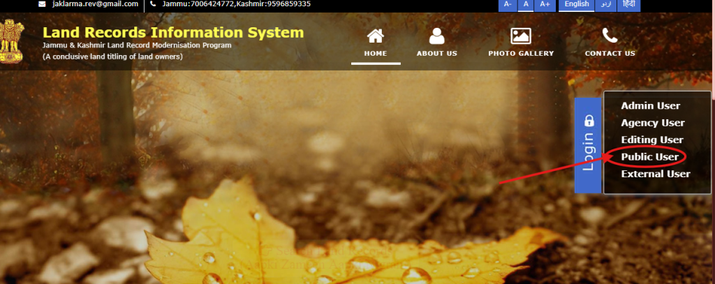 Visit the official website https://landrecords.jk.gov.in/ and on the right of the login button click on public user