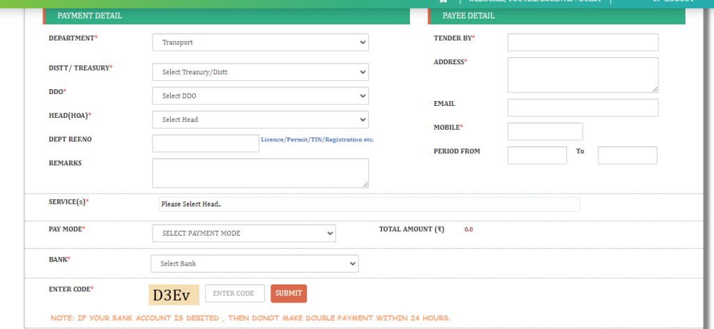 Select the particular department for challan payment and enter all the required details, select the payment mode and bank enter the captcha click on submit, and make your payment