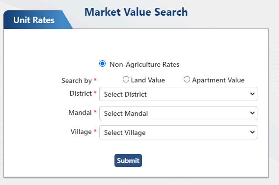 To get the required area of land rates in a particular district, you need to select District, Mandal and village and click on submit